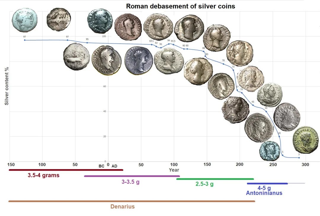150 years after Julius Caesar and his heir Octavian (later Augustus) established the Roman Empire, Roman emperors began to devalue their currency.